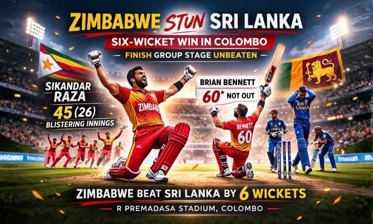 Colombo: Zimbabwe delivered a strong statement in their final group fixture, defeating co-hosts Sri Lanka by six wickets at the R Premadasa Stadium. The win not only sealed their unbeaten run in the group stage but also underlined their growing confidence ahead of tougher contests.